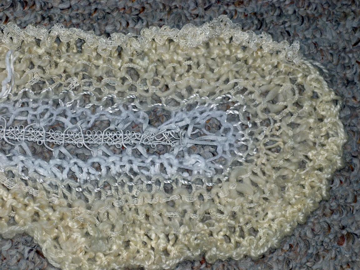 Using one of my magic balls of yarn, I picked up every other loop on one side with a size 11 needle, and then picked up the remaining loops on the other side with another size 11 needle, placing two markers at each end. Then I just continued knitting one entire round, and then purling the next so I had a garter effect, and continued in this fashion until it was wide enough.